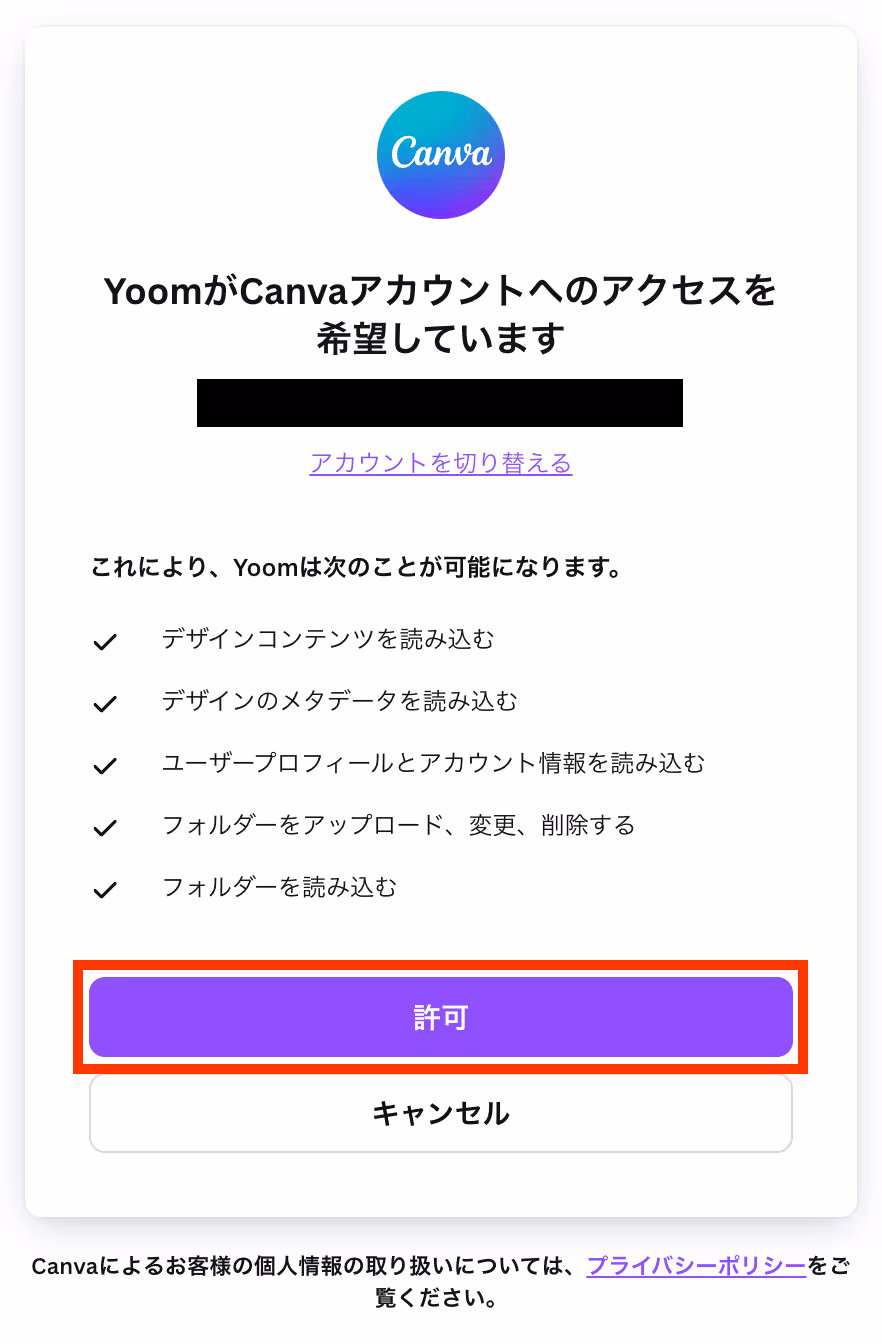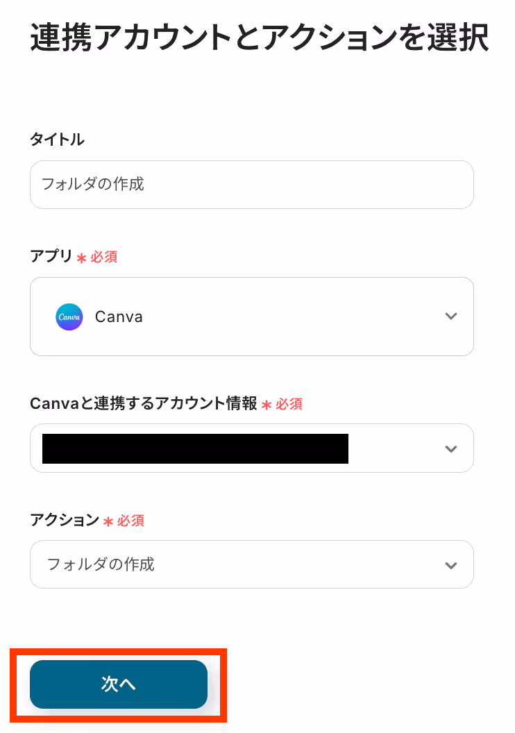 アカウント情報には、ステップ1のCanvaのマイアプリ連携で選択したものが入力されています。