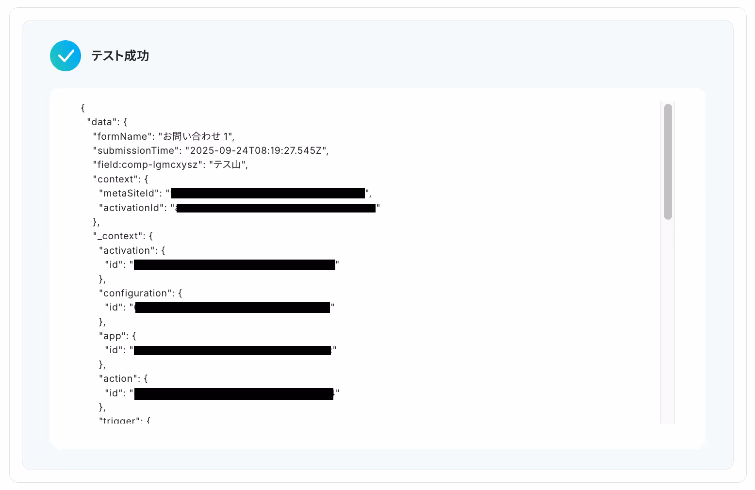 取得した値に、送信内容が正しく表示されていることを確認したら保存しましょう。