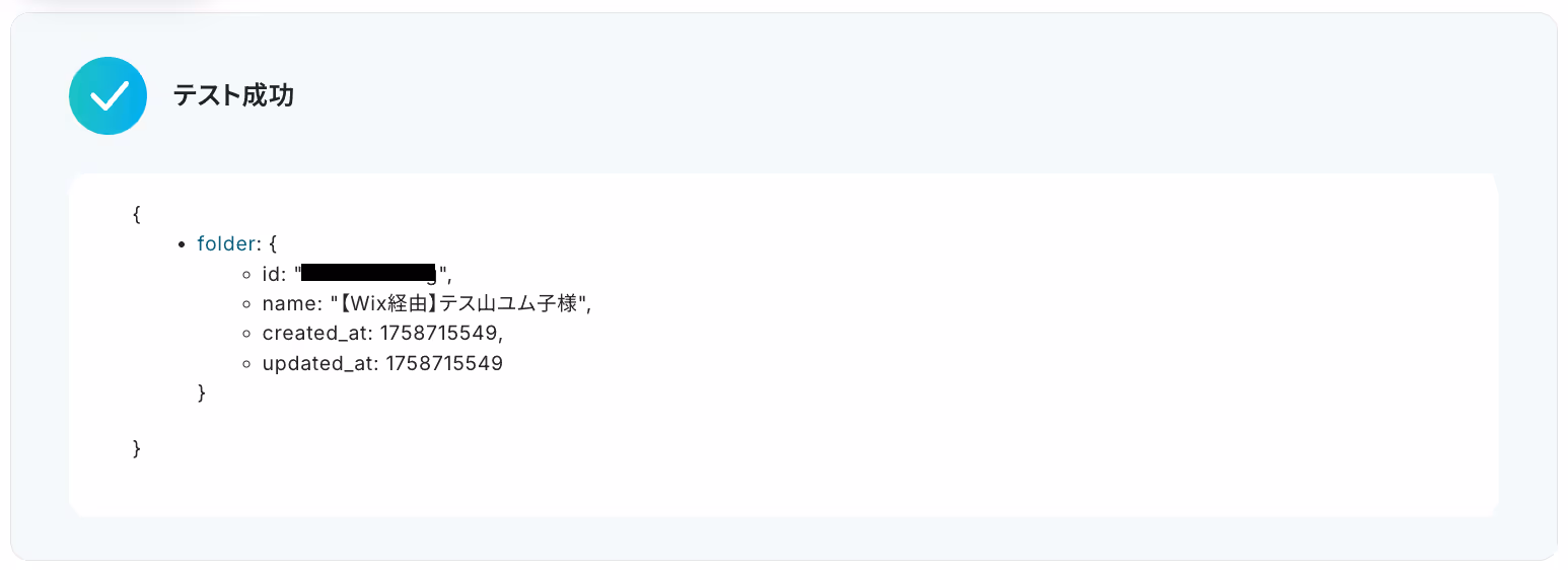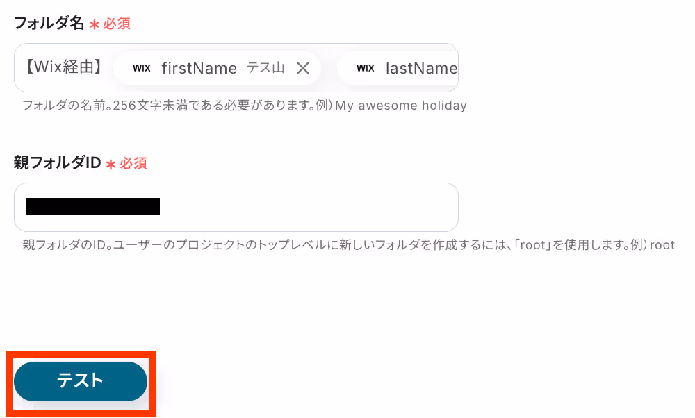 例えば、フォルダ名に固定の文字列(例:「Wixからの問い合わせ」)だけを設定した場合、毎回同じ名前でフォルダが作成されてしまいます。