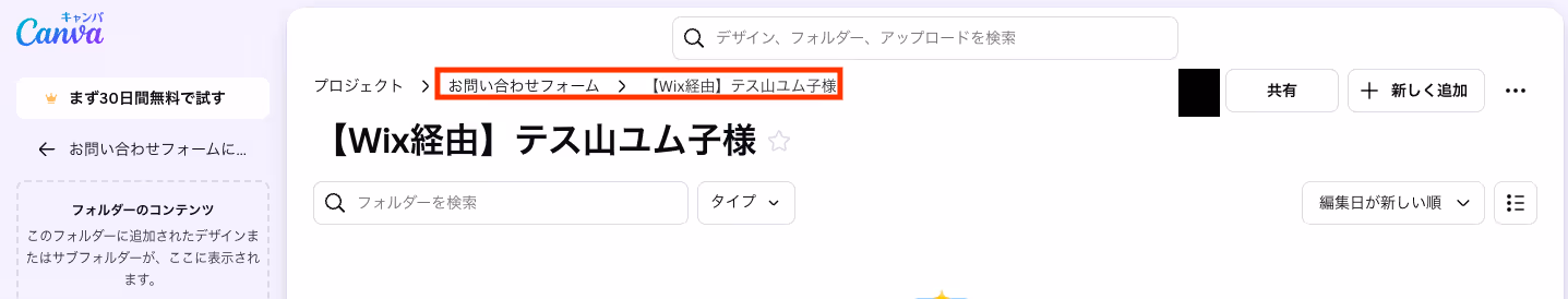実際に、Wixのフォームが送信されたタイミングでCanvaに自動でフォルダを作成できるか確認してみましょう!