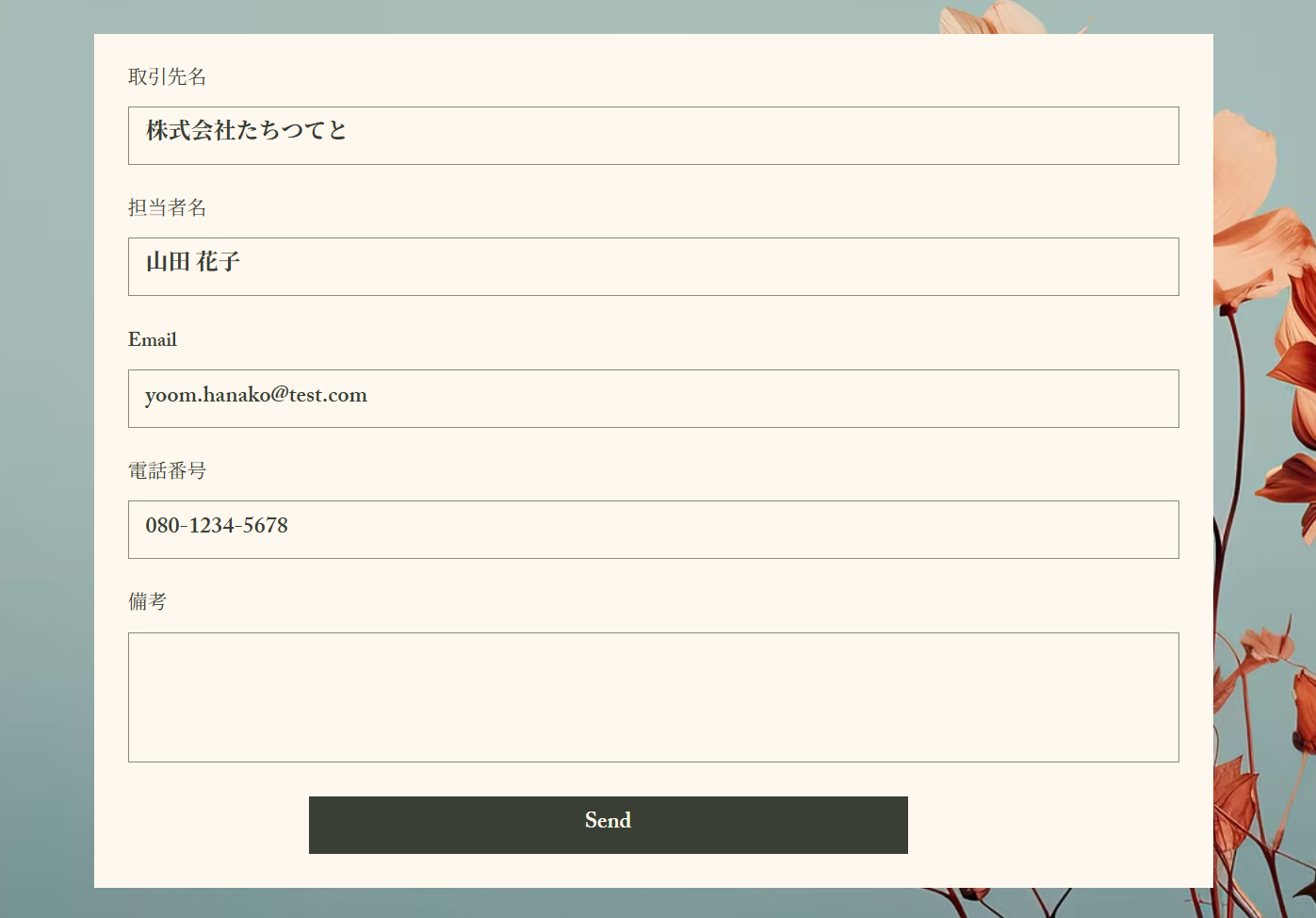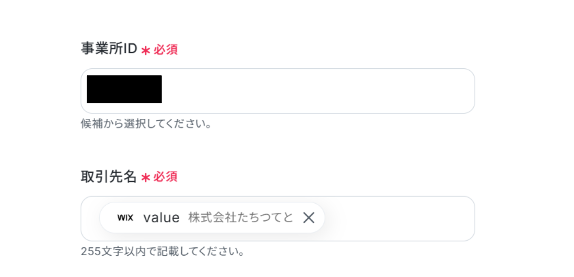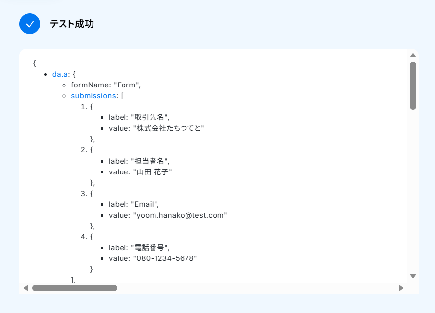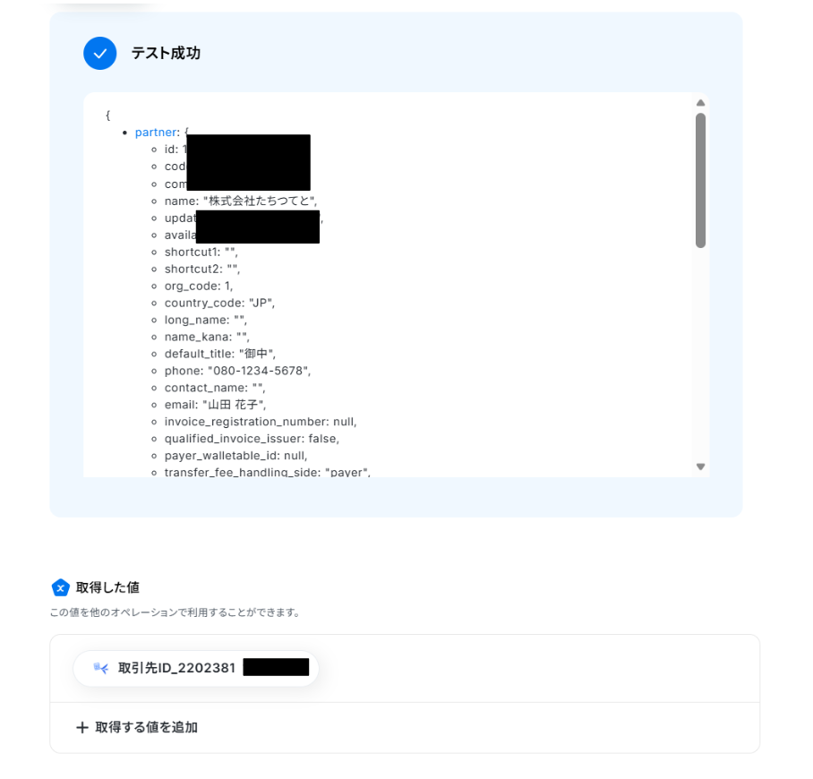 画像では、テスト結果が取得した値に反映されていないので、フォームに送信された情報はまだ未登録の取引先になります。