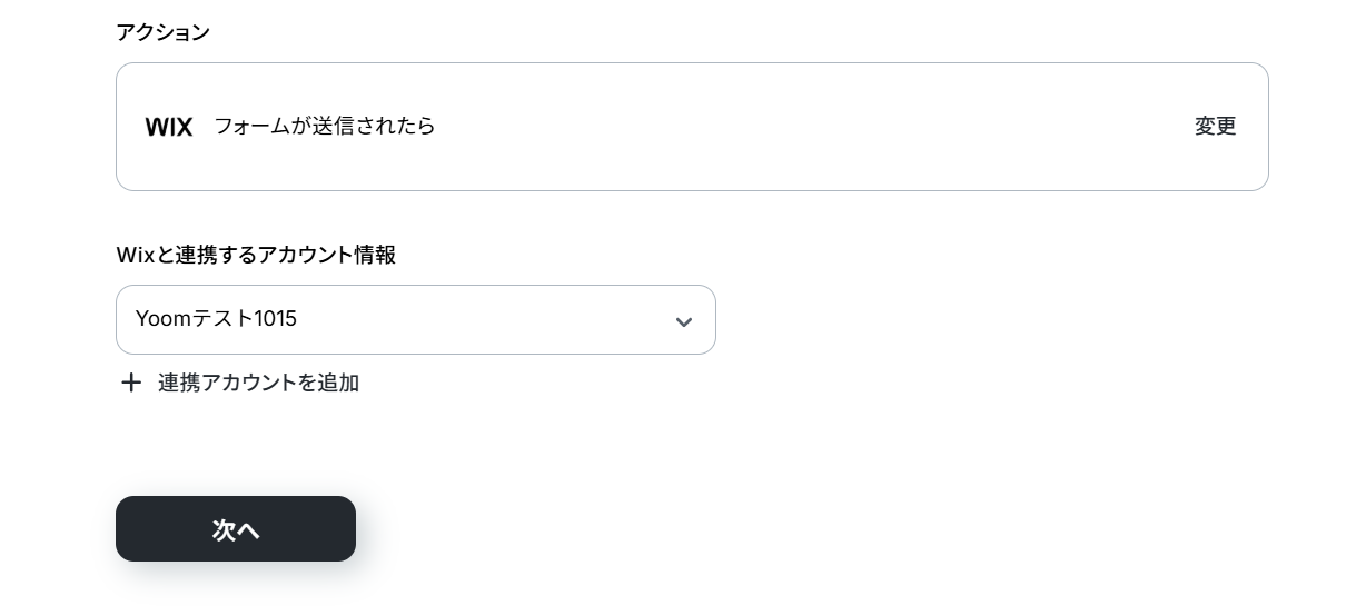 Wixと連携するアカウント情報に誤りがないかを確認し、アクションは「フォームが送信されたら」のままで「次へ」をクリックします。