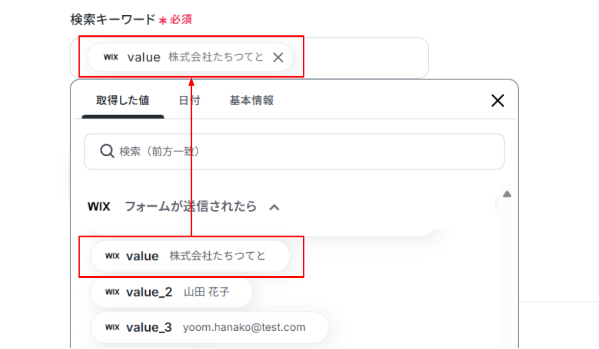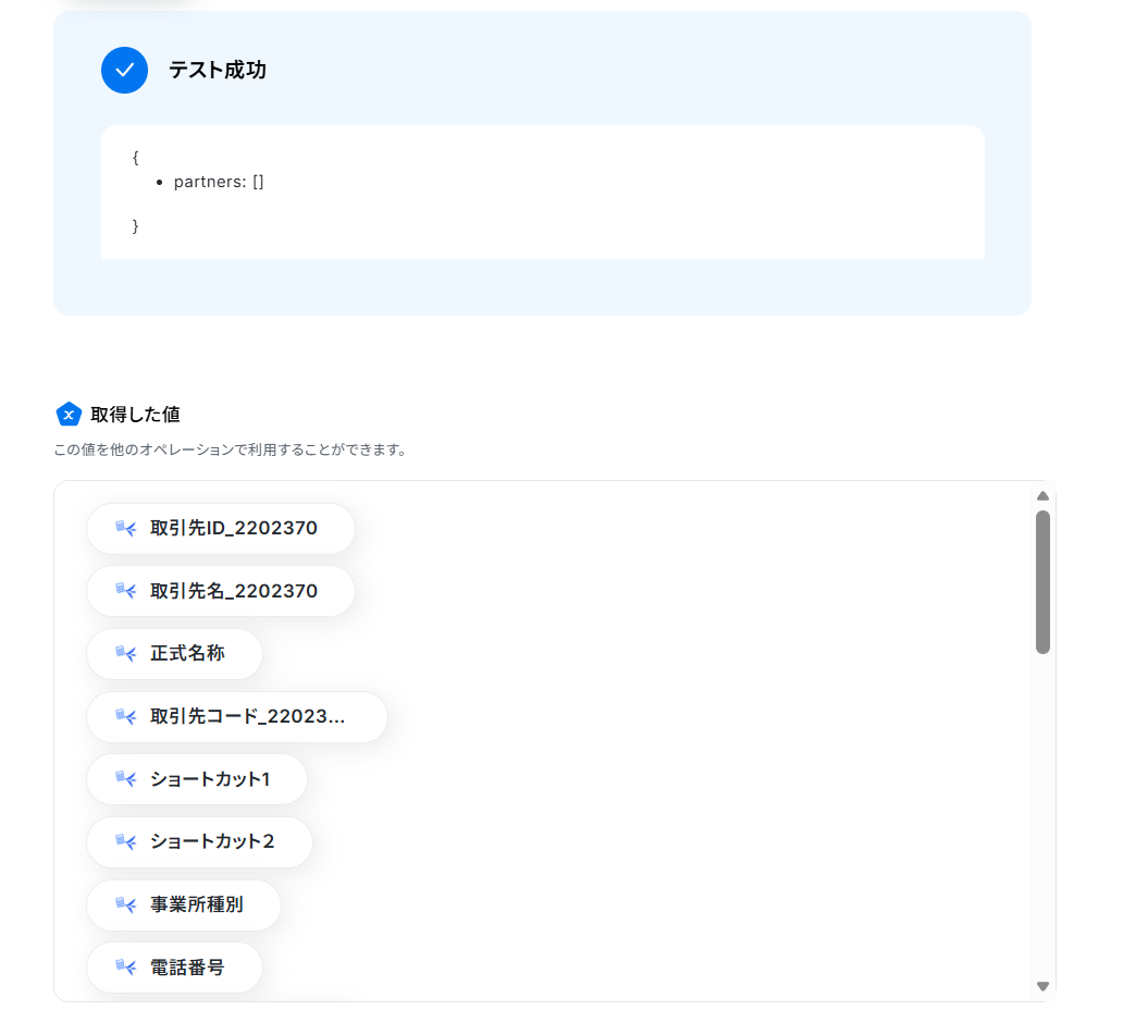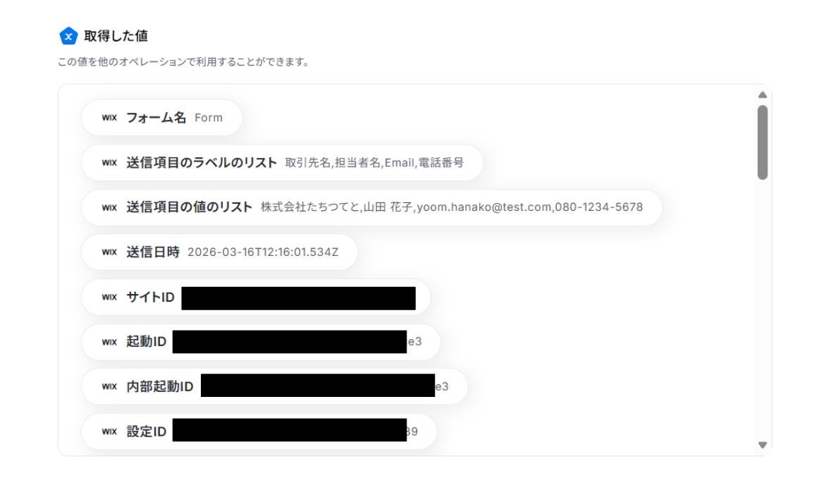 テストに成功すると「取得した値」にWixの情報が反映されます。