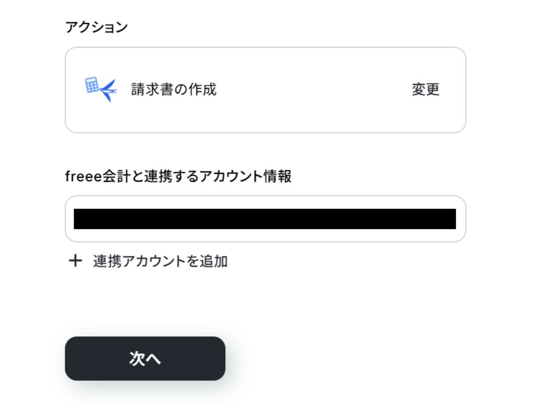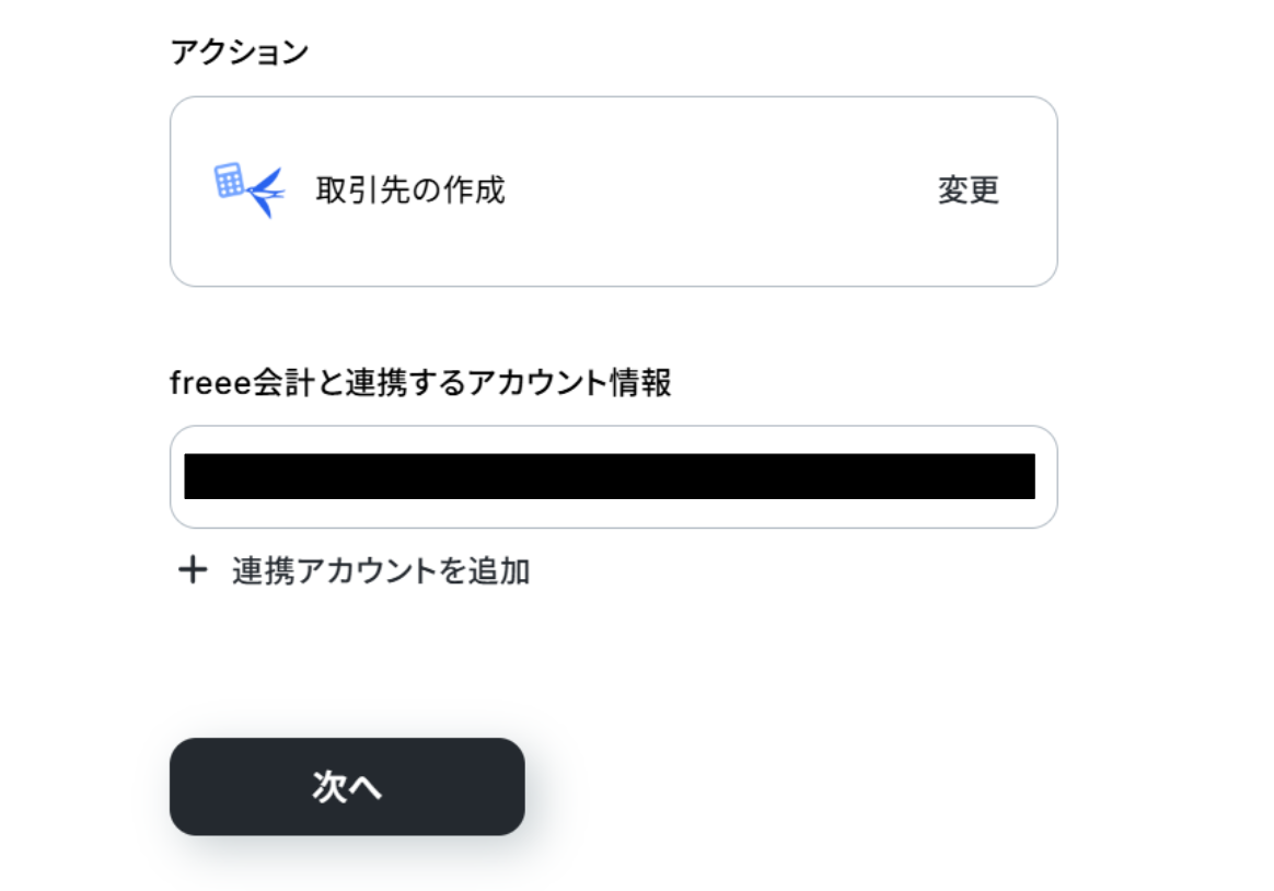 freee会計と連携するアカウント情報に誤りがないかを確認し、アクションは「取引先の検索」のまま「次へ」をクリックします。