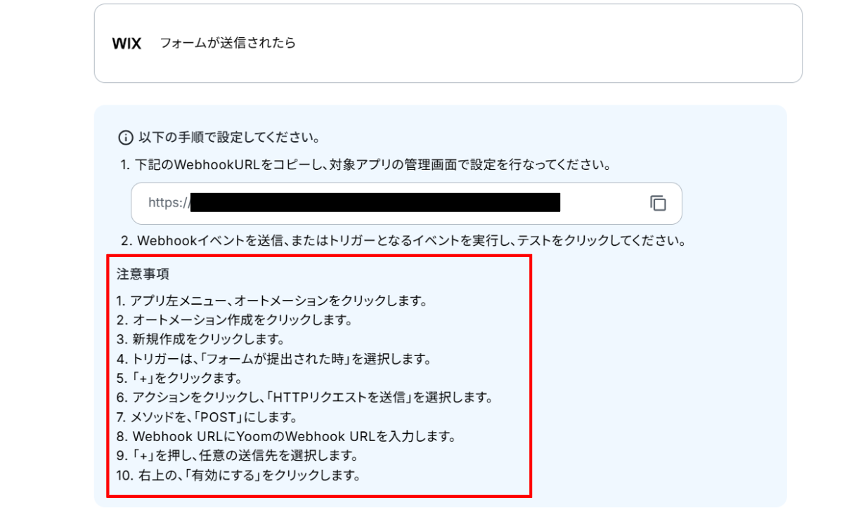 赤枠を確認の上、Wixの管理画面からWebhoookURLの設定を行ってください。