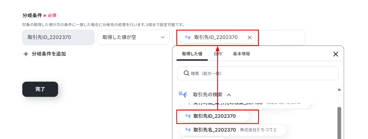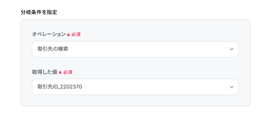 画像では「取引先ID」の取得した値が空白のものを条件に設定しています。