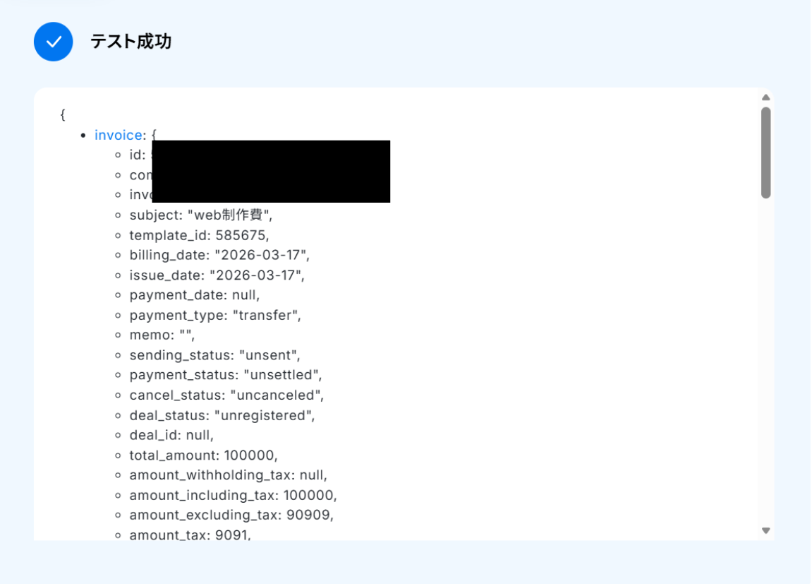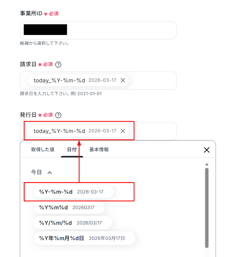 - freee会計で請求書を作成する各オペレーションにおいて、請求書を発行したい任意の事業所IDを設定してください。また、各項目の登録値は前段で取得した情報や固定の値を使用して自由にカスタマイズできます。