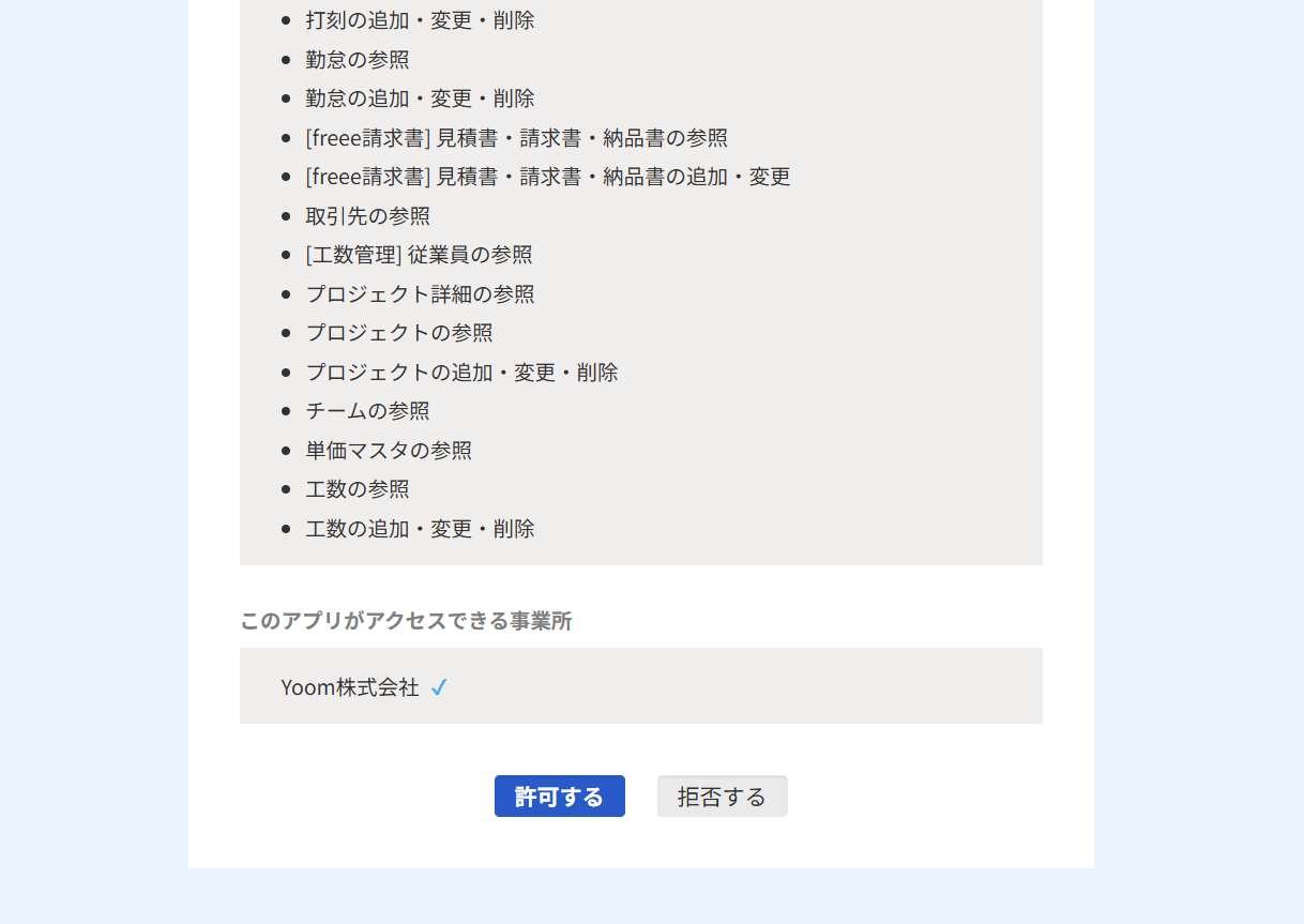 アプリ連携の開始画面から下へ進み、「許可をする」をクリックします。