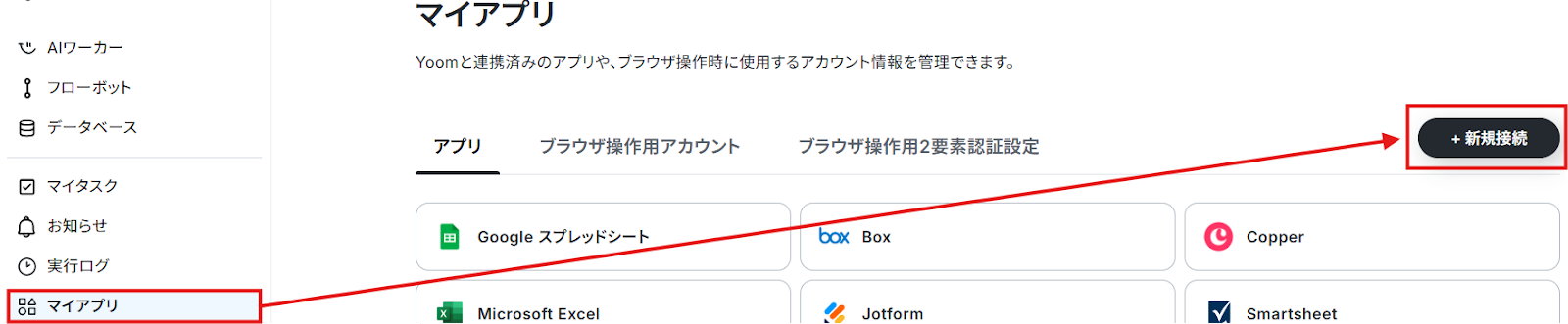 左側のメニューバーにあるマイアプリをクリックして、新規接続を選択しましょう。