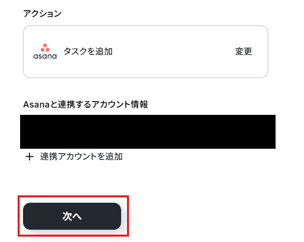 - 続いて、Asanaの「タスクを追加」アクションを設定し、AI機能で抽出した情報を基にタスクを作成します。