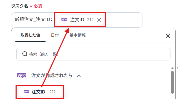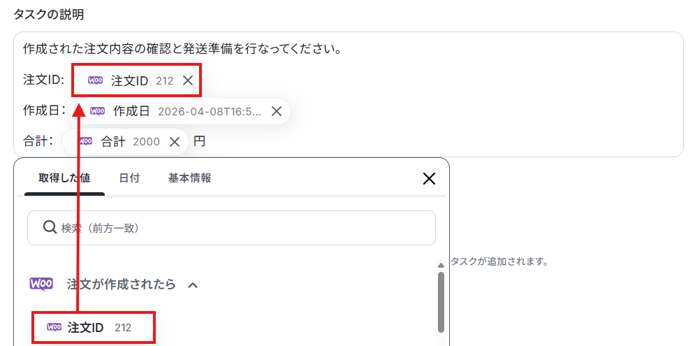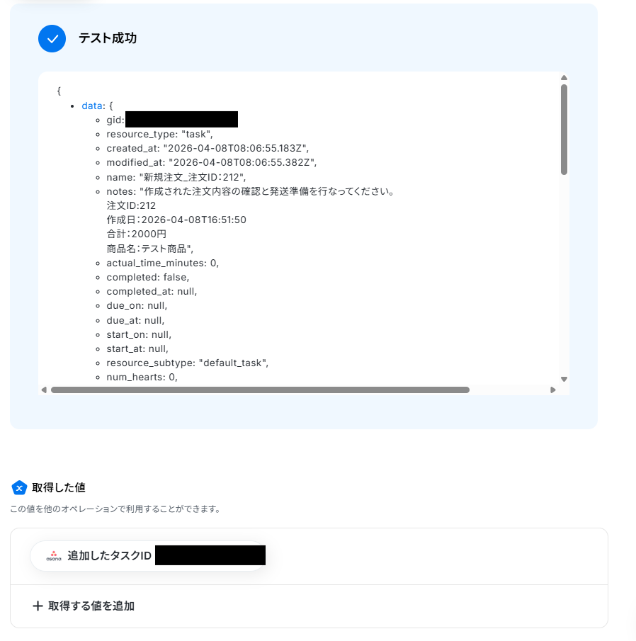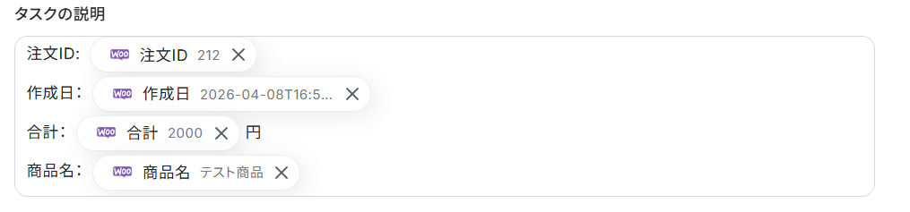 - Asanaで「タスクを追加」する際には、WooCommerceの注文情報やAIが生成したテキストなど、事前のアクションで取得した値をタスク名や詳細に設定してください。