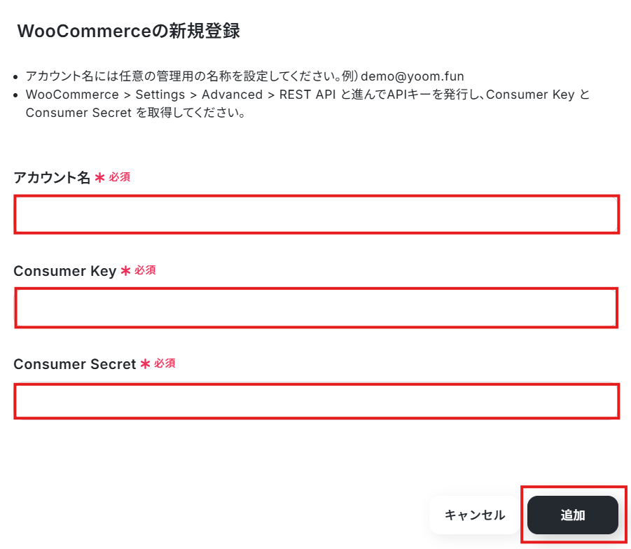 Consumer KeyとConsumer SecretをWooCommerceから取得して入力しましょう。