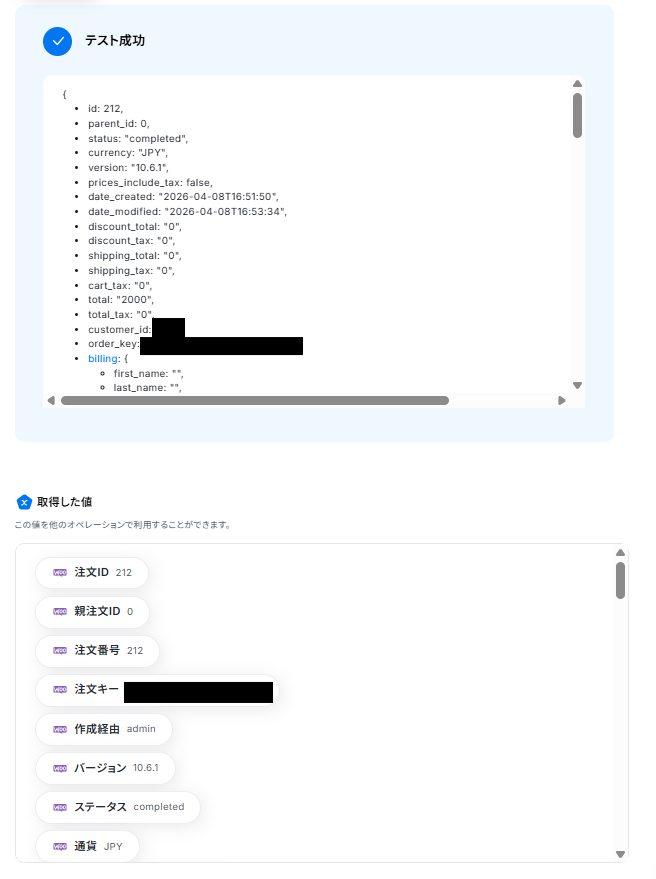 テストに成功すると取得した値にテストで取得した情報が反映されます。