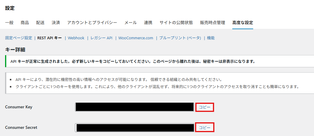 ※WooCommerceでConsumer KeyとConsumer Secretを取得する方法