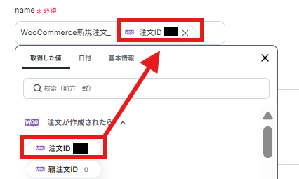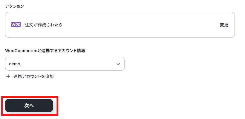 まずはこのフローボットでトリガーになっている、WooCommerceの「注文が作成されたら」を設定していきましょう。