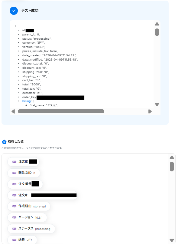 取得した値とは、トリガーやオペレーション設定時に、「テスト」を実行して取得した値のことを指します。