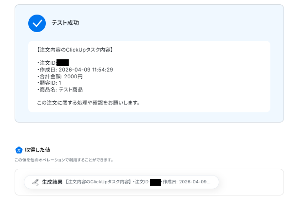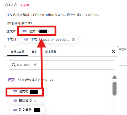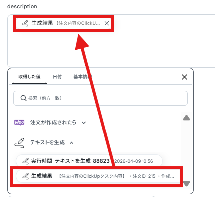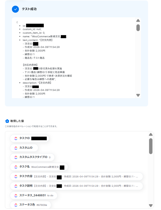 - ClickUpの「タスクを作成」アクションでは、タスク名、担当者、リストなどを任意で設定してください。WooCommerceの注文情報やAIが生成したテキストを変数として利用し、動的なタスク作成が可能です。