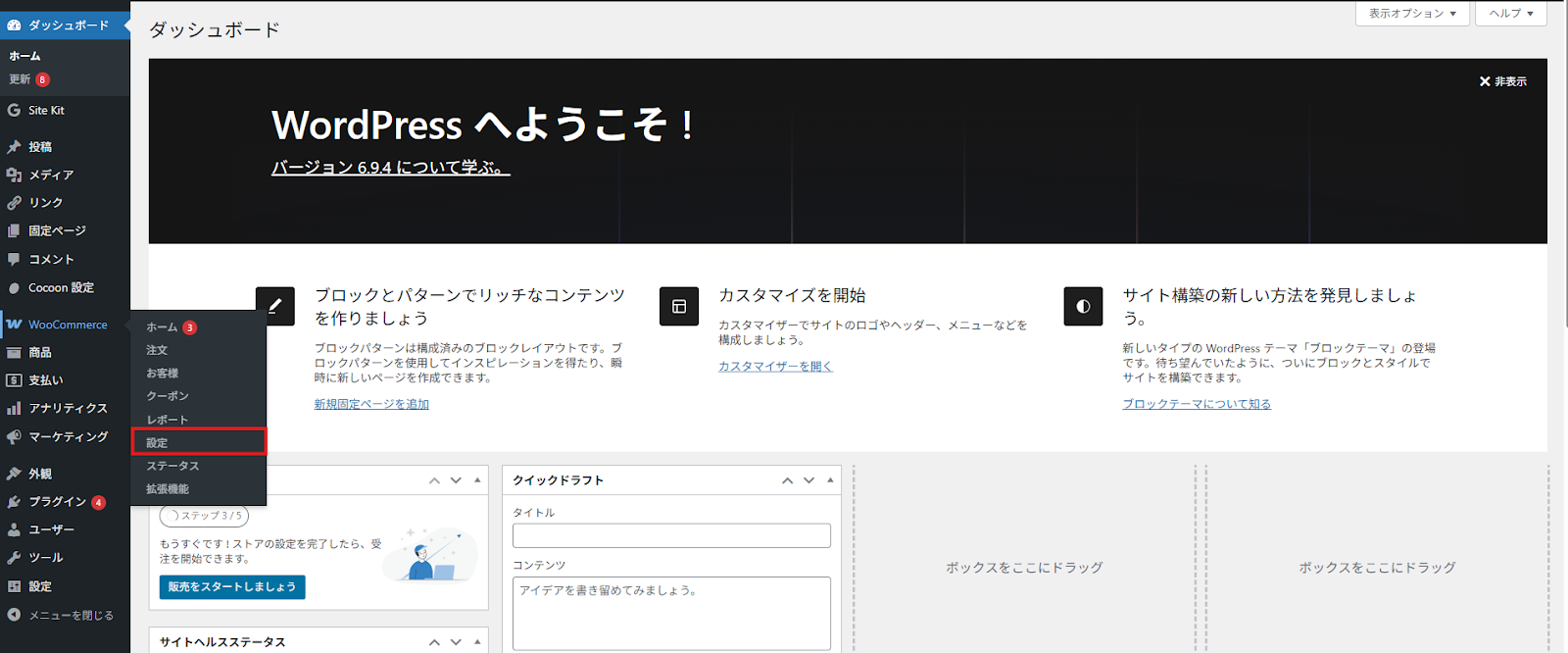 WooCommerceにログインして、WooCommerce→設定を選択します。