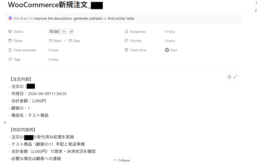 「WooCommerceで新規注文が入るたびに、注文内容をClickUpに手動で転記してタスクを作成している…」