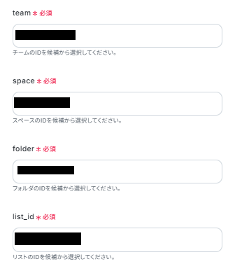 「team、space、folder、list_id」は以下のように全て候補から選択してください。