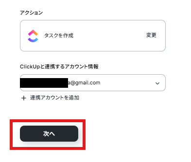 アクションはデフォルト設定のまま、アカウント情報は、連携したいアカウントが選択されているか確認してください。確認が終わったら「次へ」で進みましょう。