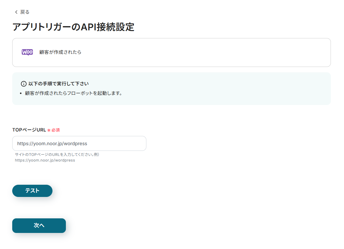 TOPページURLを注釈に沿って入力し、テストをクリックしてください。