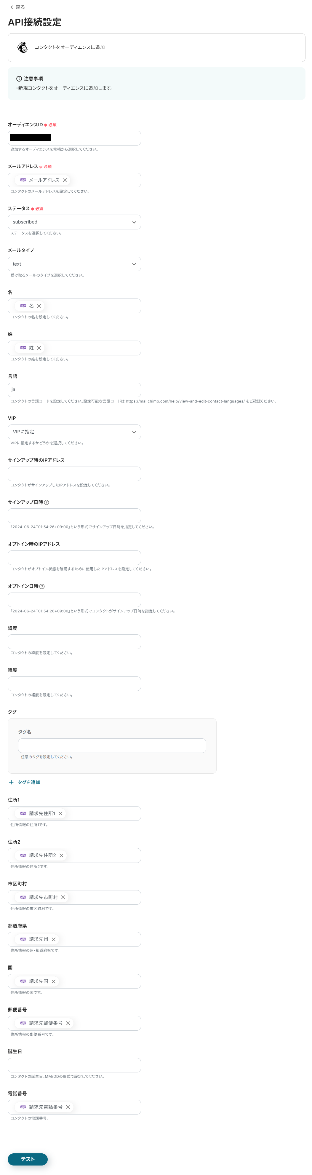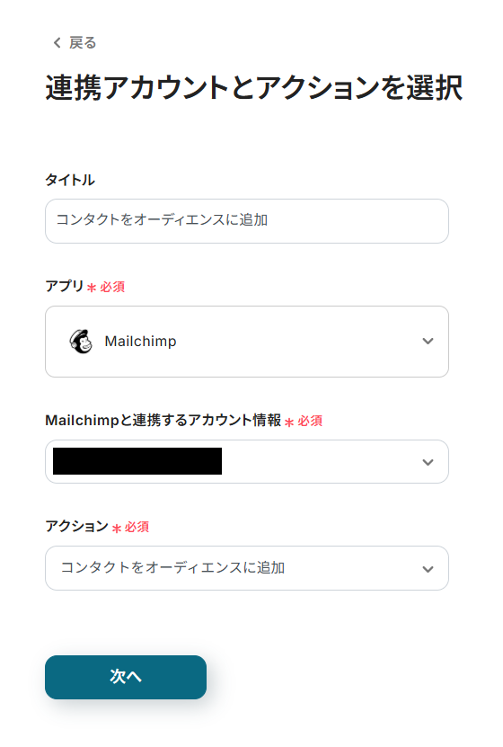- 最後に、Mailchimpの「コンタクトをオーディエンスに追加」アクションを設定し、新しい顧客情報をオーディエンスに登録します。