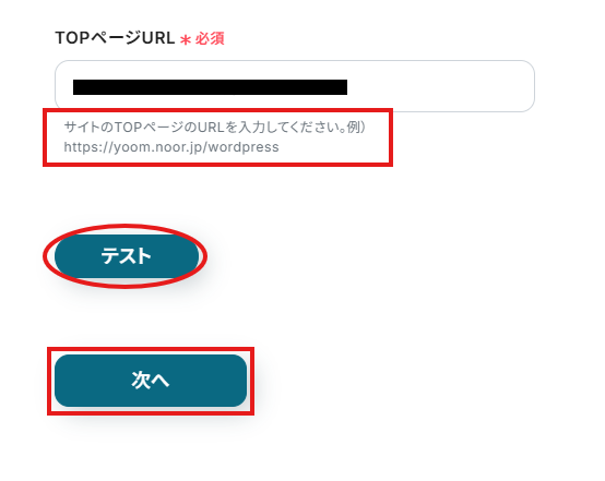 入力したら、「テスト」を実行し「次へ」をクリックしましょう。