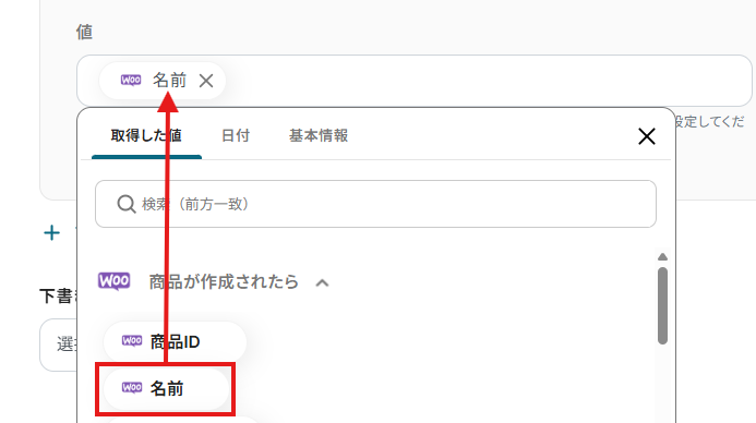 「値」は、入力欄をクリックして表示される取得した値から選択してください。