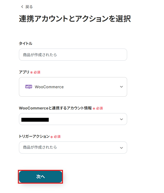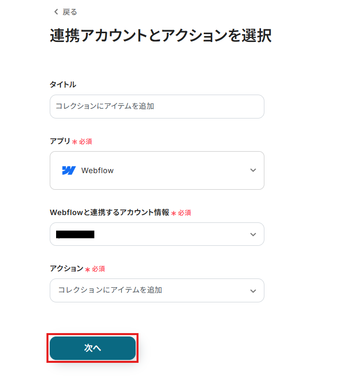 連携するアカウント情報には、ステップ1で連携したアカウント情報が反映されています。トリガーアクションはそのままにして、「次へ」をクリックしてください。