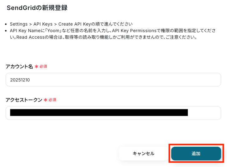 Yoomの新規登録画面に戻り、アクセストークン欄にコピーしたAPIキーを貼り付けます。