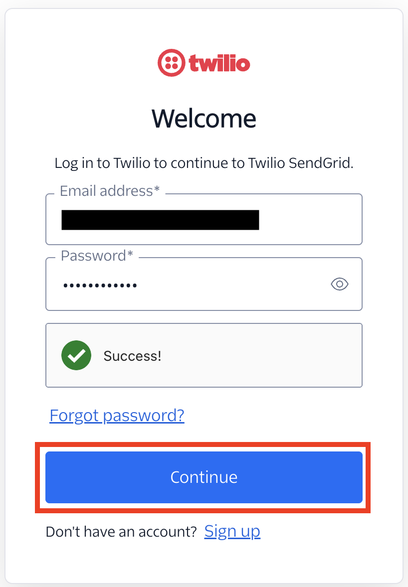 はじめに、SendGridのログインページを開き、ユーザー名を入力して「Continue」をクリックします。