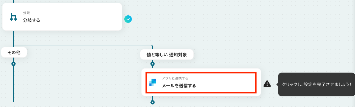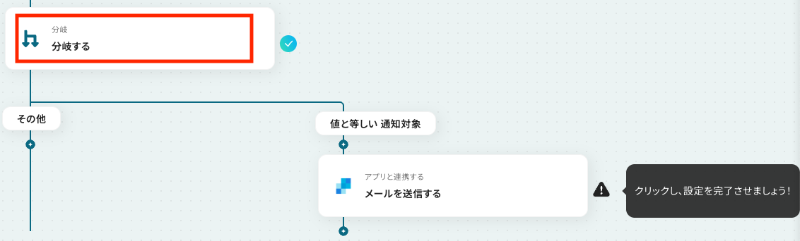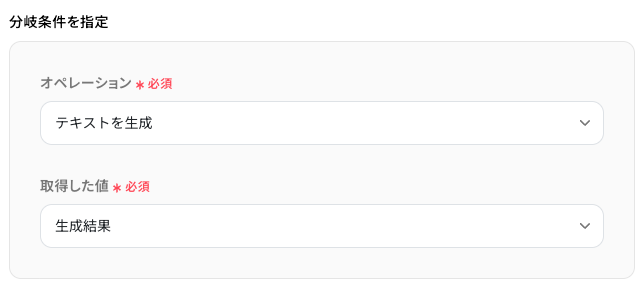 - 次に、分岐機能を設定し、AIによる分析結果(例:「ポジティブ」「ネガティブ」など)を基に、後続の処理を分岐させるための条件を設定します。