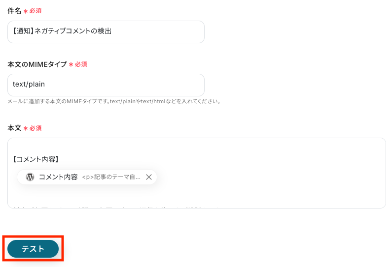 - SendGridで送信するメールの宛先、件名、本文は自由に設定でき、トリガーで取得したコメント内容やAIの分析結果を変数として本文に差し込むことも可能です。