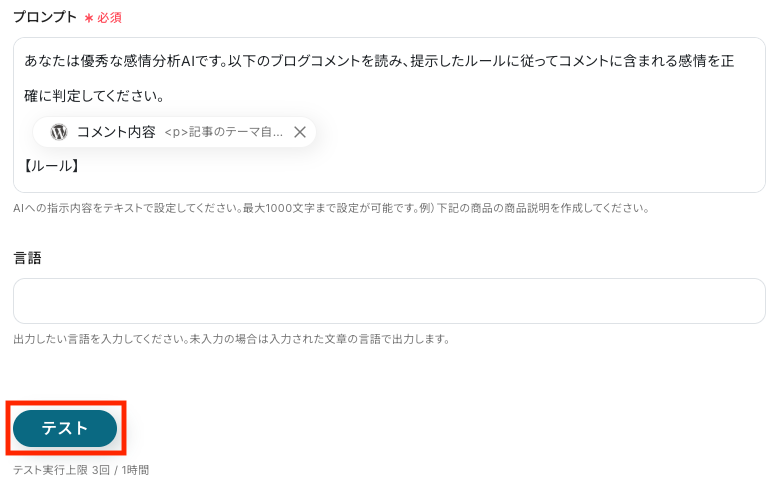 - 次に、オペレーションでAI機能を設定し、投稿されたコメント内容を分析するためのプロンプト(指示文)を入力します。
