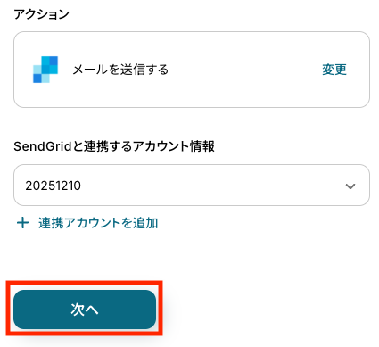 - アカウント情報:ステップ1で連携したアカウントが自動で選択されています。別のアカウントを使用したい場合は、「+ 連携アカウントを追加」から変更可能です。