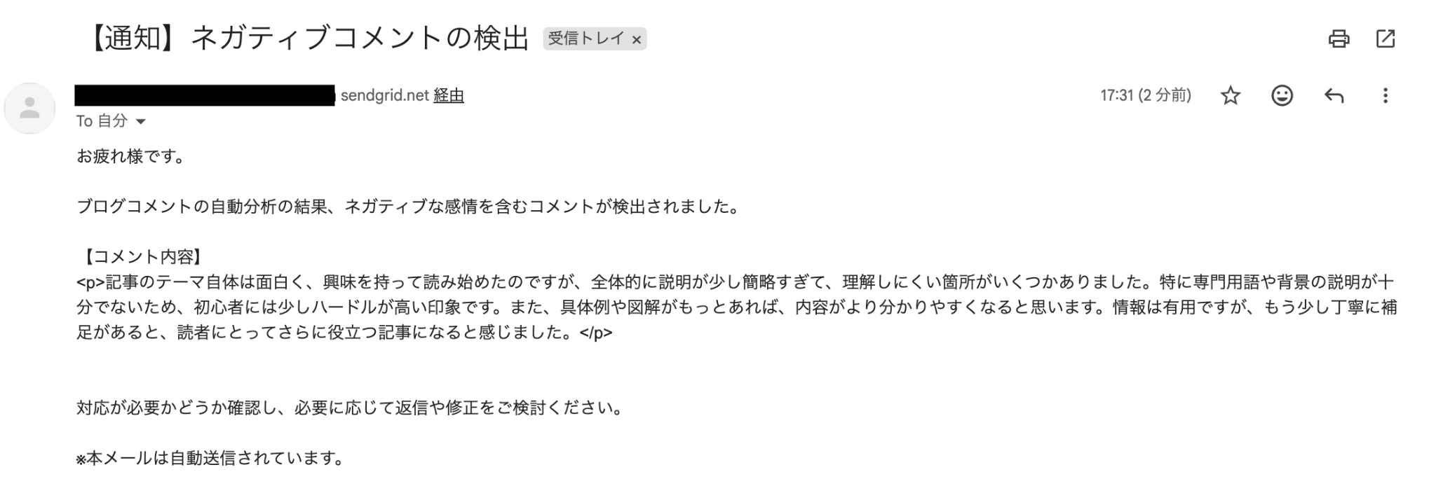 - WordPress.orgへのコメント投稿から感情分析、SendGridでの通知までが自動化されるため、これまで手作業での確認や判断に費やしていた時間を短縮できます。