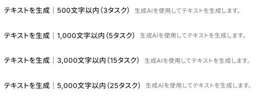 - テキスト生成機能では、生成したい文章の文字数に応じて適切なアクションを選択し、AIへの指示(プロンプト)や出力言語を任意で設定してください。