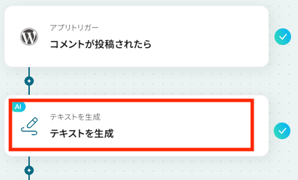 - 次に、オペレーションでテキスト生成機能の「テキストを生成する」アクションを設定し、取得したデータに基づいてAIに文章を生成させます。