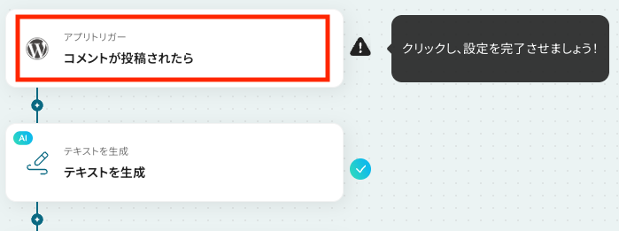 - 次に、トリガーでWordPress.orgを選択し、「コメントが投稿されたら」というアクションを設定し、フローが起動するきっかけを作成します。
