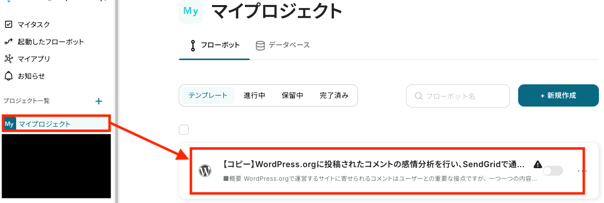 マイプロジェクトから、「【コピー】WordPress.orgに投稿されたコメントの感情分析を行い、SendGridで通知メールを送信する」を選んでください。