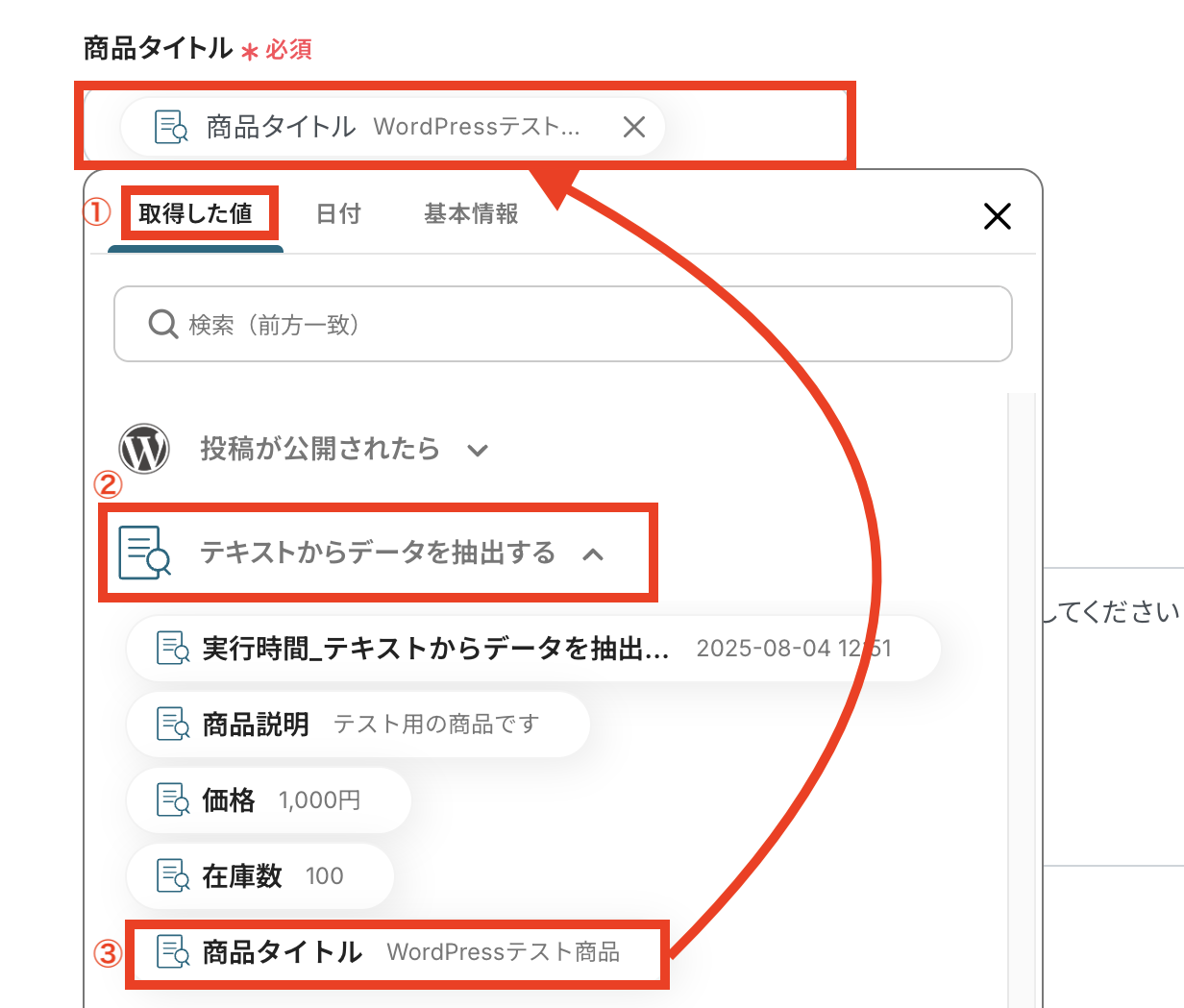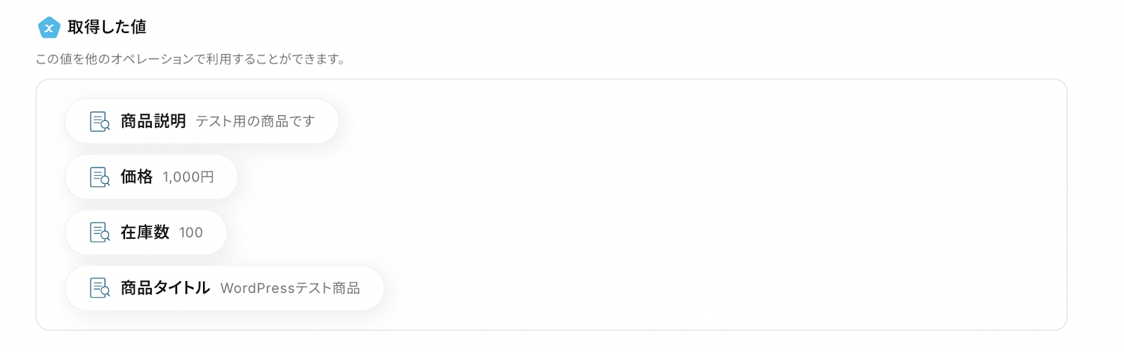 テストに成功すると「取得した値」の欄に WordPressで投稿した記事のデータがアウトプットされるので、確認できたら「保存する」をクリックしましょう!