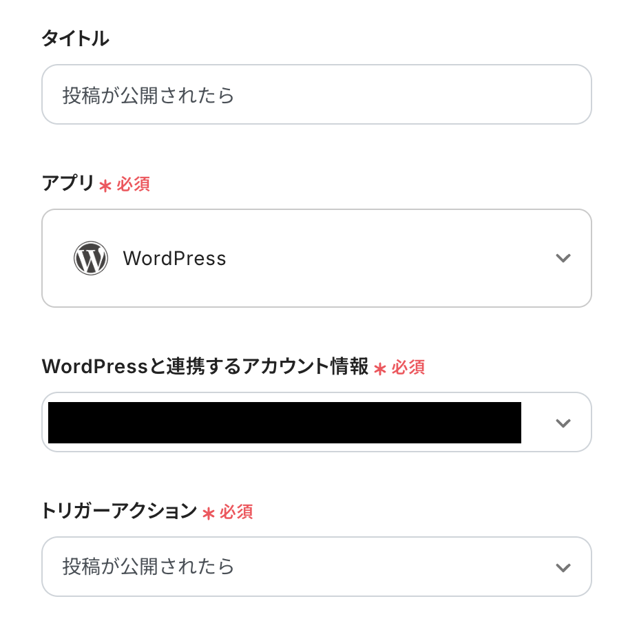 「トリガーアクション」:「投稿が公開されたら」を選択