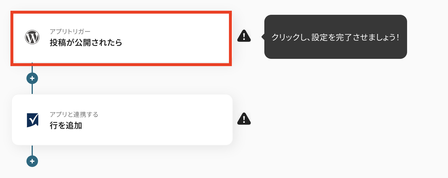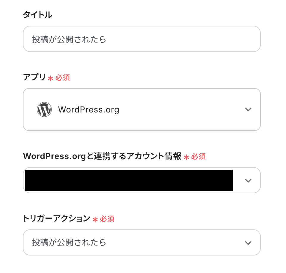 「トリガーアクション」:デフォルトで「投稿が公開されたら」が選択されているので、そのままでOKです!