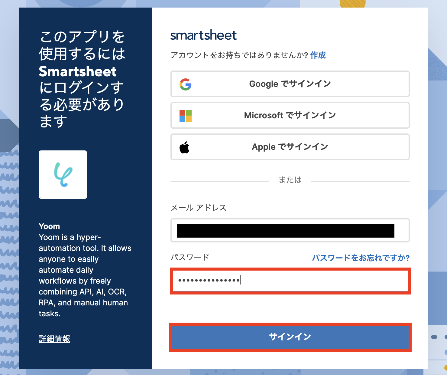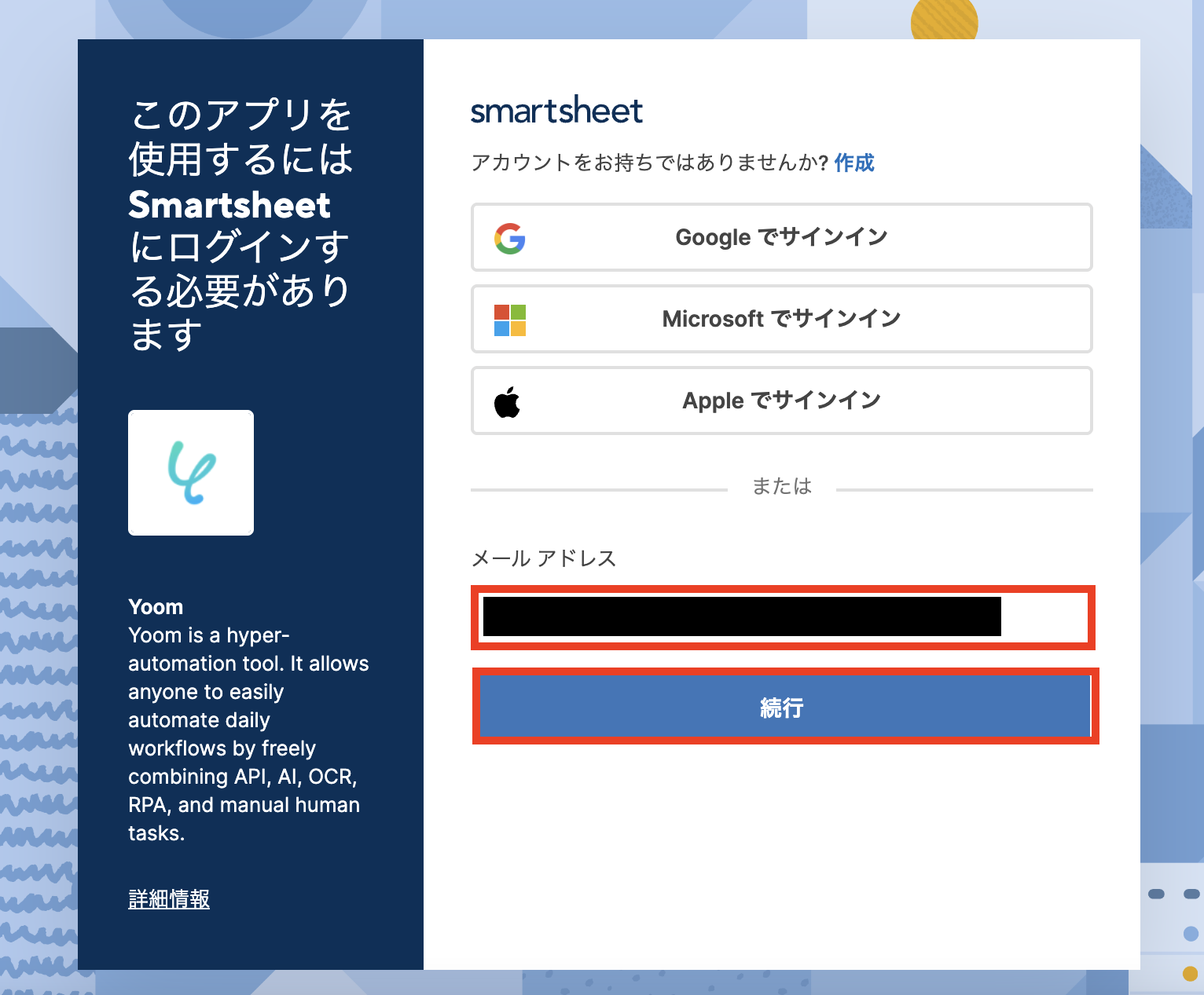 アプリ一覧でSmartsheetを検索すると、ログインページが表示されるので「メールアドレス」を入力して「続行」をクリックします。
