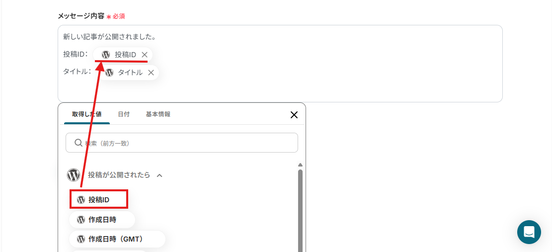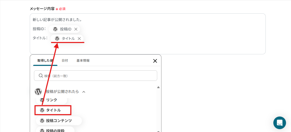 この設定により、WordPressで投稿が公開されたら「投稿ID」と「タイトル」を取得し、Telegramのメッセージに自動で反映することができますよ。