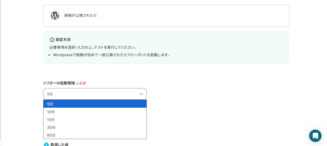 トリガーの起動タイミングは、5分、10分、15分、30分、60分のいずれかで設定できます。