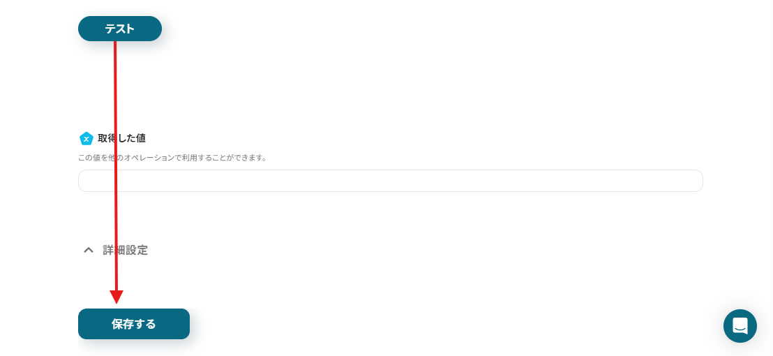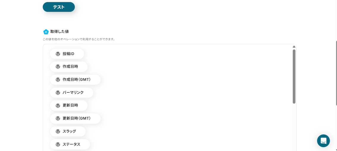 ここまで設定できたら成功後、WordPressに投稿した情報が取得した値(アウトプット)に表示されるので、確認後「保存する」をクリックしましょう。