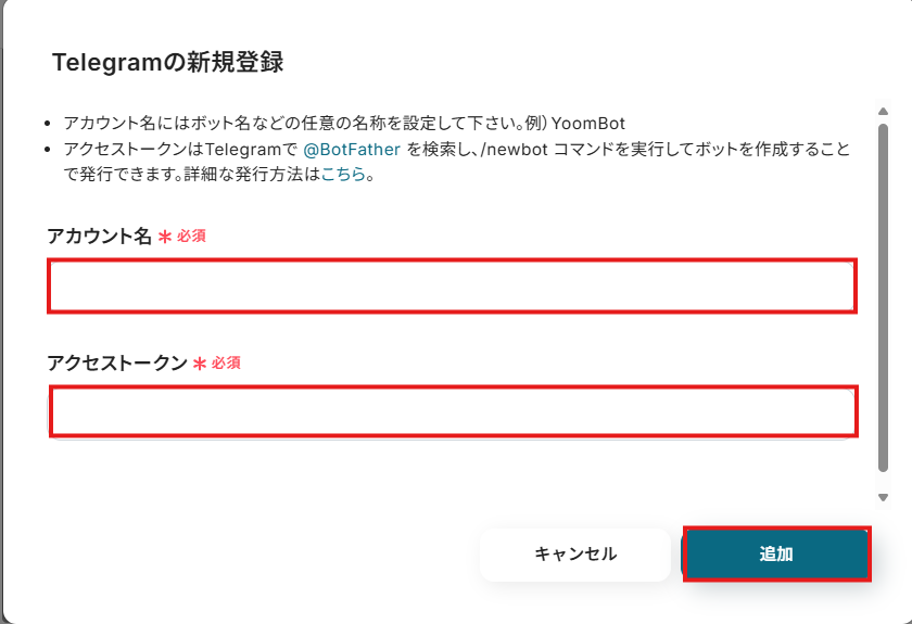 「アカウント名」と「アクセストークン」を入力しましょう。