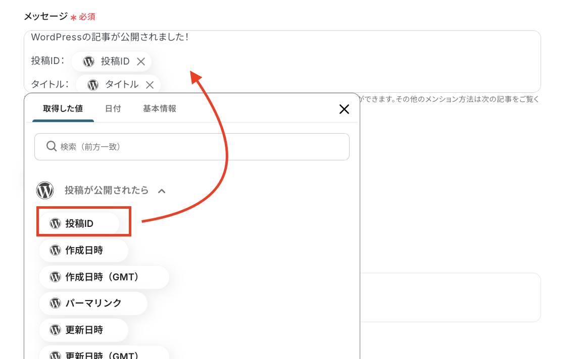 「メッセージ」は入力ボックスをクリックし、以下のように前ステップで取得した値を引用することで、投稿情報をそのままSlackの通知メッセージに組み込めます。